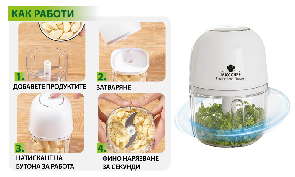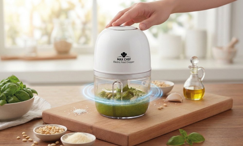 MaxChef Electric Chopper ускорява подготовката с едно натискане. Мини размер, голям ефект – компактен и безшумен с кухнен мулти-чопър за бързо и равномерно нарязване у дома и на път.