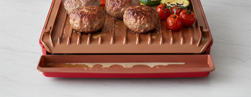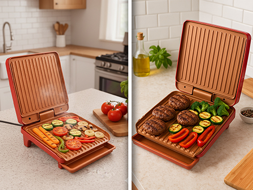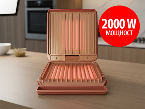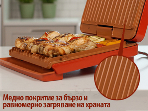 Плочите на грила са покрити с висококачествено покритие, което е едновременно незалепващо и устойчиво на драскотини. Това гарантира дълготрайна употреба и лесно почистване.Медното покритие не само придава стилен вид на грила, но и подобрява топлопроводимостта, осигурявайки бързо и равномерно загряване на храната, както и незалепващи свойства на покритието.
