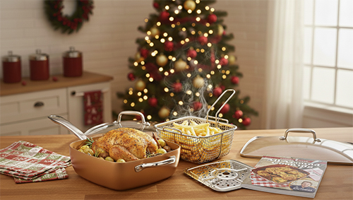 Copper Chef е с 60% по-голям от обикновените кръгли тигани. Получавате джъмбо тиган 6-в-1 незалепващ тиган Cerami-Tech покритие и 60% повече място за готвене, заедно с комплект първокласни аксесоари! Луксозен комплект, който замества тенджери, тигани, тави, гевгир, грилован тиган за печене, уок и тиган за пържене. Гответе апетитни, вкусни ястия без добавени мазнини.