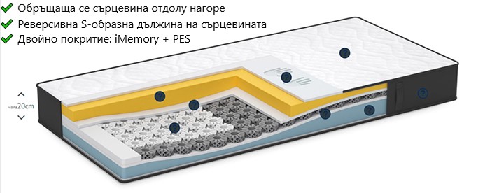 Пълнеж: iMemory пяна + 4 см допълнително memory, Climalite влакна, Ecocell® пяна, PES подплата Octaspring® пружини