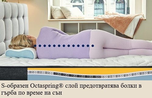 Матракът е с S-образен Octaspring® слой с три зони на комфорт, който следва формата на гръбначния стълб и запазва естествените му извивки през цялата нощ, независимо от позицията на сън. С опорна точка предотвратява болки в гърба, свързани със съня.
