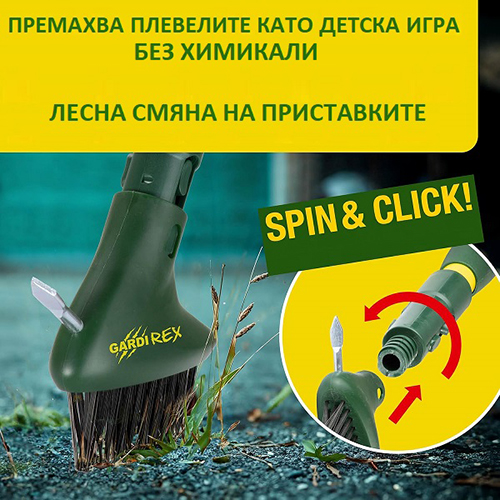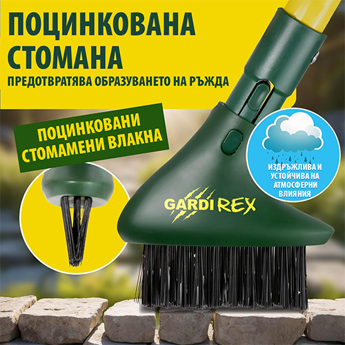 Четката за плевели GardiREX е специално проектирана за лесно премахване на плевели и треви от фуги между тротоарни плочки и по ръбове на огради. Осигурява ефективно и бързо почистване, благодарение на иновативния дизайн и качествените материали, използвани за изработката ѝ. Издръжлива и устойчива на атмосферни влияния, GardiREX е перфектен избор за дългосрочна употреба в различни условия.