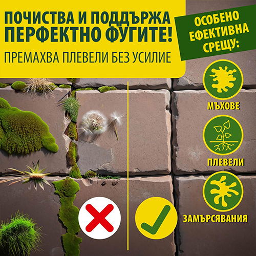 Специалната форма и конструкция на четката осигуряват лесно и ефективно премахване на плевели и треви, без да увреждат околната настилка. Чистите фуги и ръбове са гарантирани с минимални усилия.