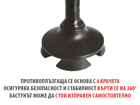 Сигурността е на първо място, благодарение на стабилната основа с 4 противоплъзгащи крачета, която осигурява стабилност както вътре, така и на открито, дори в дъждовно време (не върху лед). Освен това, основата следва естественото движение на глезена, което ви дава увереност при наклонени повърхности и стълби.