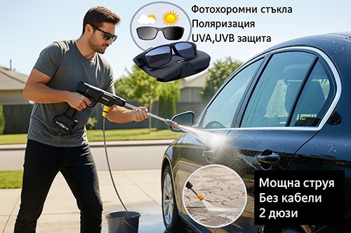 С всяка водоструйка, закупена сега, получаваш ПОДАРЪК: Сет фотохромни слънчеви очила NUVUE + висококачествени очила за шофиране против отблясъци NuVue Drive Vision – идеалният аксесоар за шофиране след почистване на автомобила.