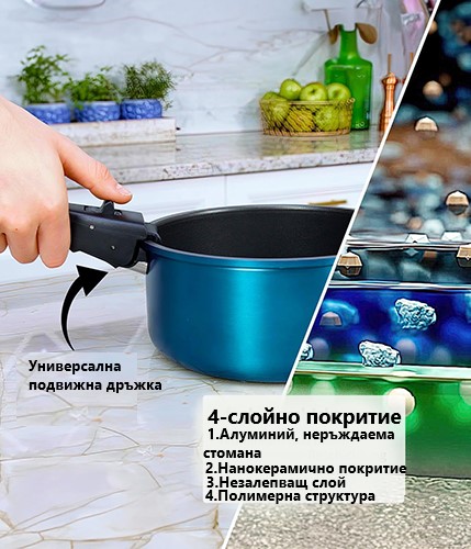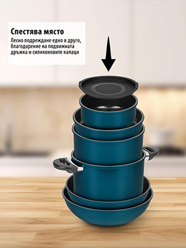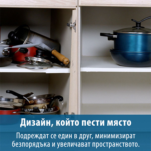 Всички елементи на комплекта се подреждат един в друг, за да спестиш място в кухнята си. Забрави за безпорядъка и се наслади на организирано пространство.