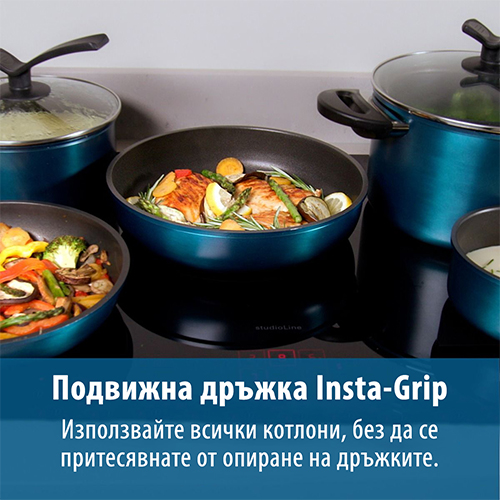 Интелигентната дръжка се прикрепя към всеки тиган и тенджера, позволявайки плавен преход от котлон до фурна, а след това – в хладилника. Заема минимално място при съхранение.