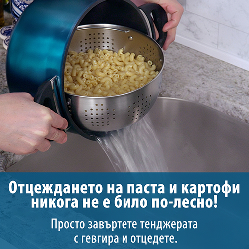 Отцеждането на паста, ориз или картофи няма да представлява никакъв проблем, след като ги сварите, отцеждането става лесно, директно от тенджерата, благодарение на включения в комплекта подвижен гевгир.