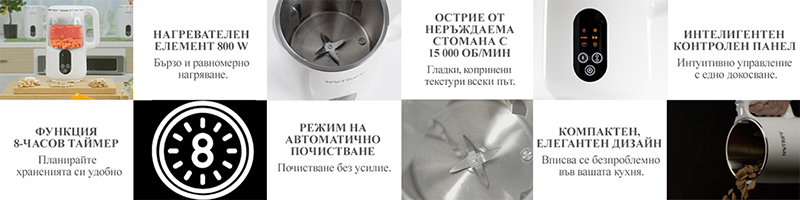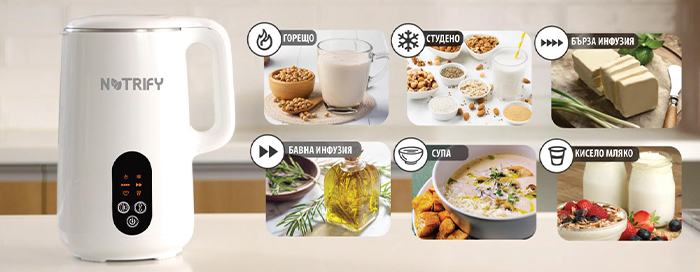 - Множество функции в един уред – ядково и соево мляко, смутита, супи, масла, кисело мляко.