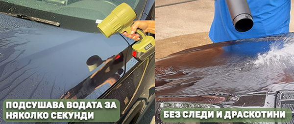 Power Blower е идеален за подсушаване на автомобил след измиване – премахва водата за няколко минути без следи и надрасквания. Отлично се справя и при почистване на градински мебели, велосипеди, инструменти, паяжини на тавана, улуци и тераси. През зимата ще ви помогне да издухате снежните следи от алеята или автомобила. Това е практичен инструмент със стотици приложения, който ще намери място във всеки дом.