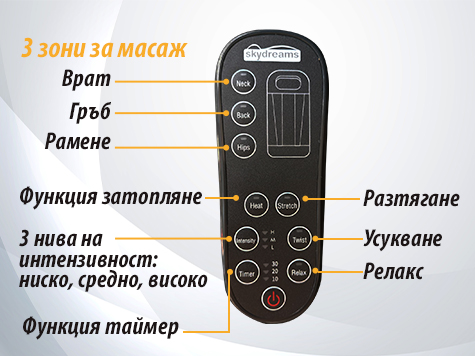 - 3 предварително зададени програми за масаж: релаксиращ, разтягащ и усукващ