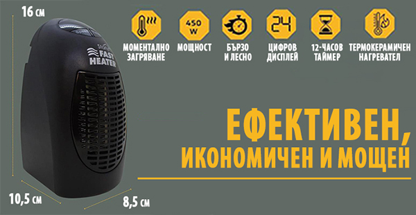 Fast Heater е достатъчно мощен, за да затопли бързо средно големи помещения, като създава комфортна среда дори в студените дни.